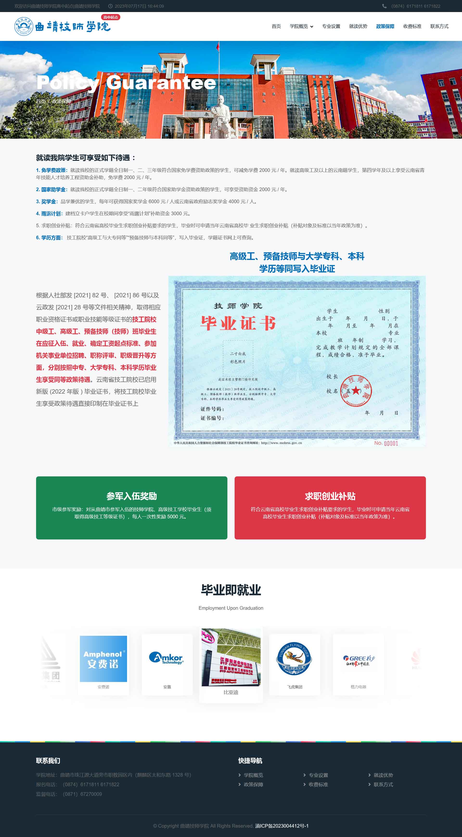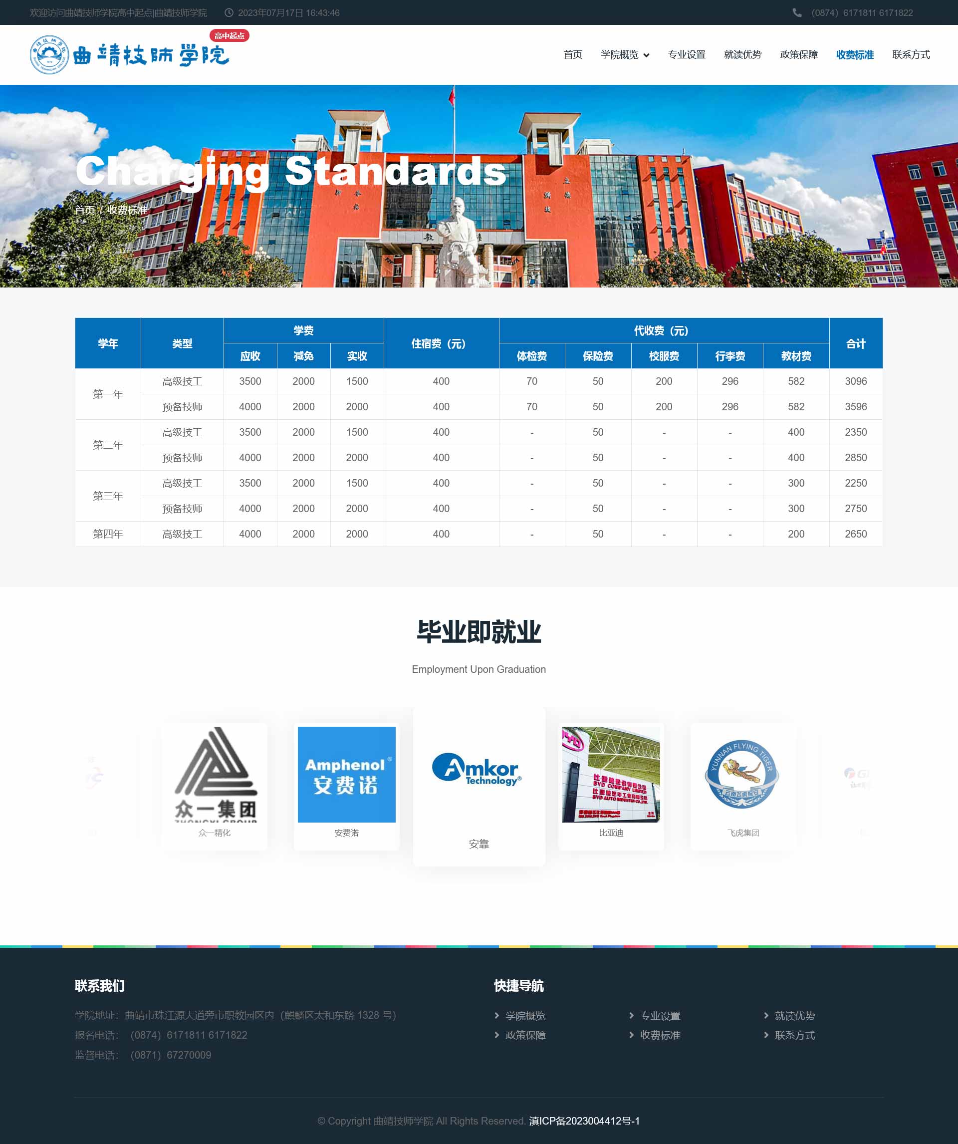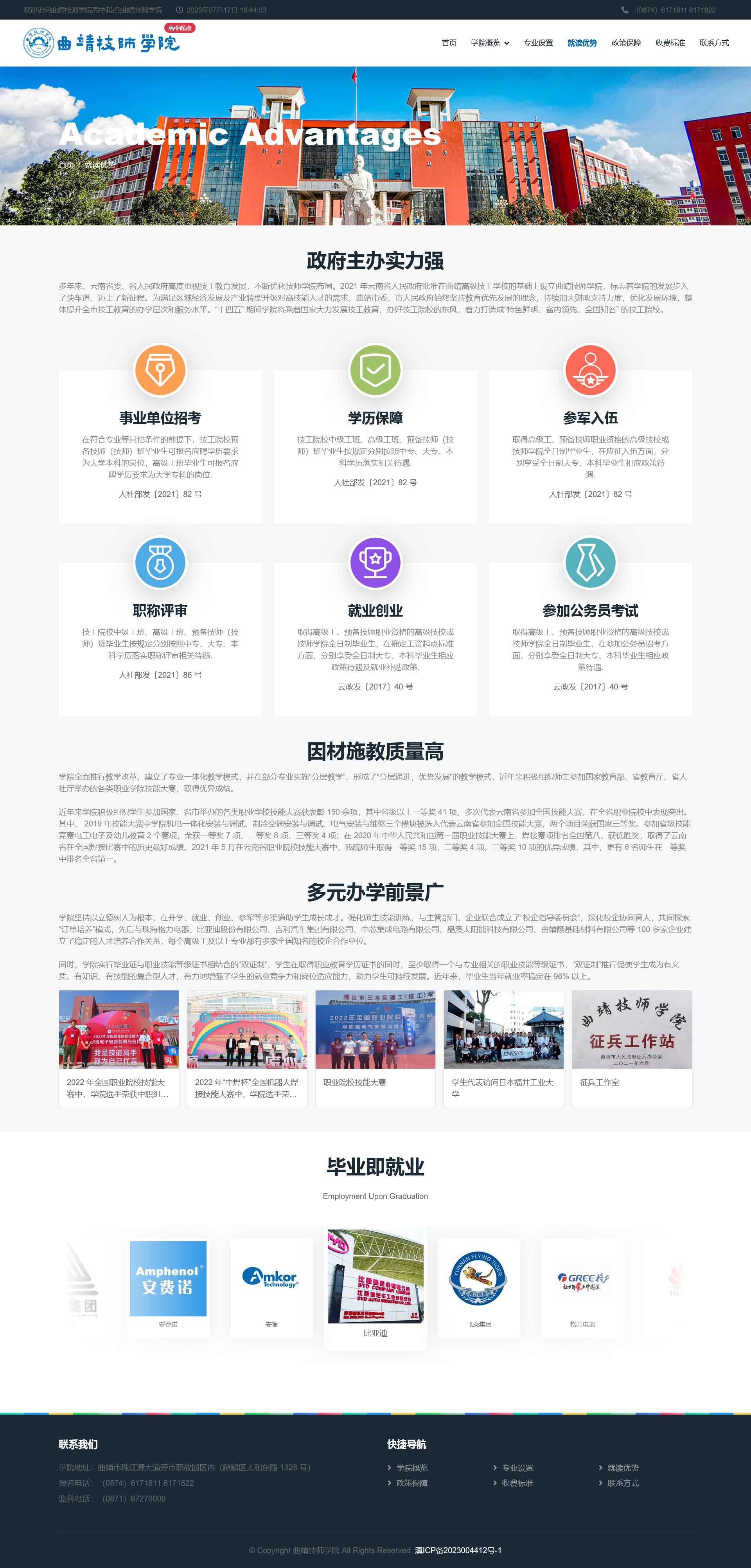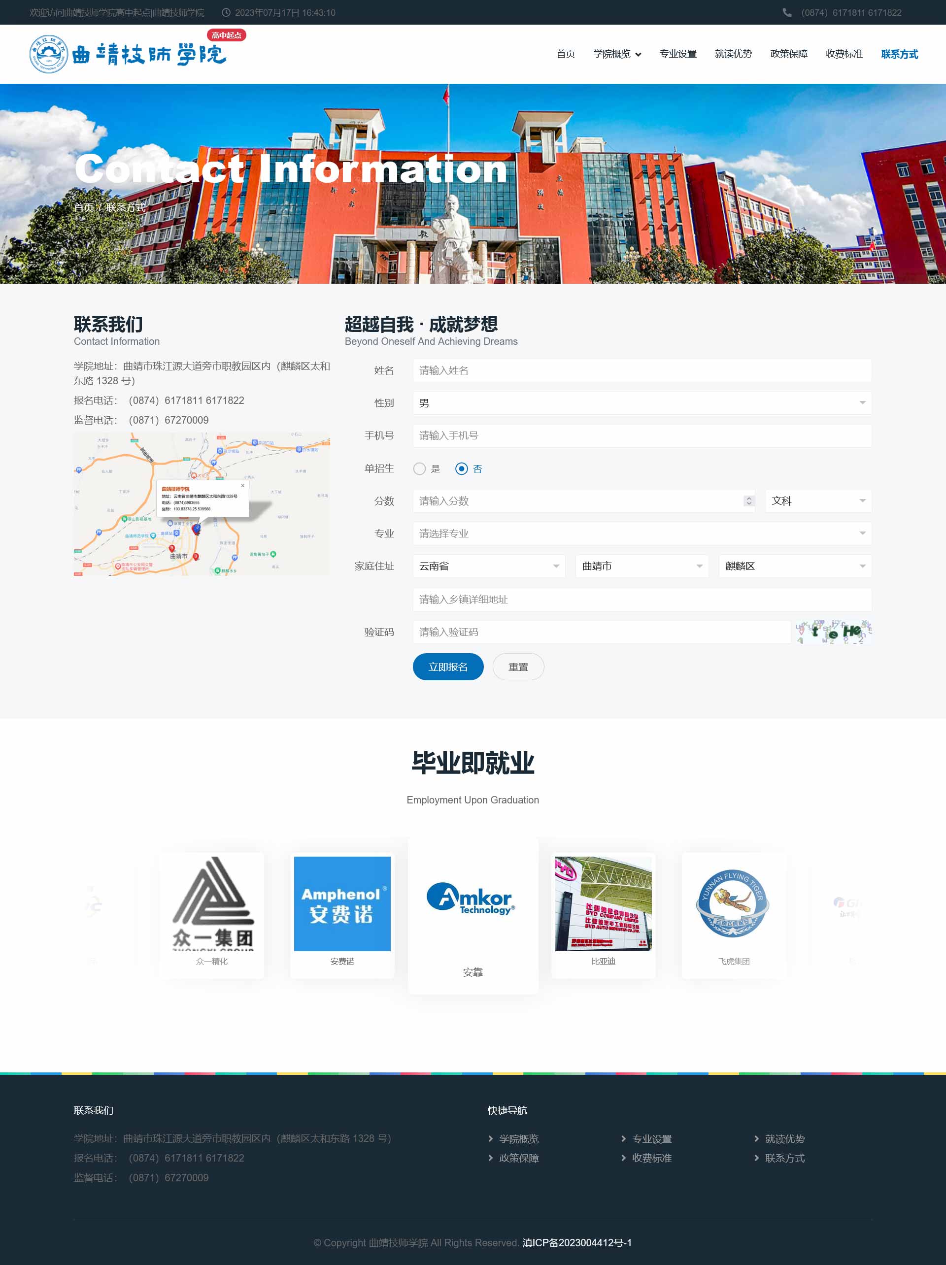 曲靖技师学院(原曲靖高级技工学校)创建于 1973 年 8 月,是曲靖市人民政府主办、曲靖市人力资源和社会保障 局主管,以培养高级工、预备技师等高技能人才为主的技工 院校。2009 年 4 月被国家人力资源和社会保障部确认为国 家重点技工学校, 2011 年 12 月被国家人力资源和社会保 障部确认为高级技工学校,2021 年 3 月经云南省人民政府 批准设立曲靖技师学院。